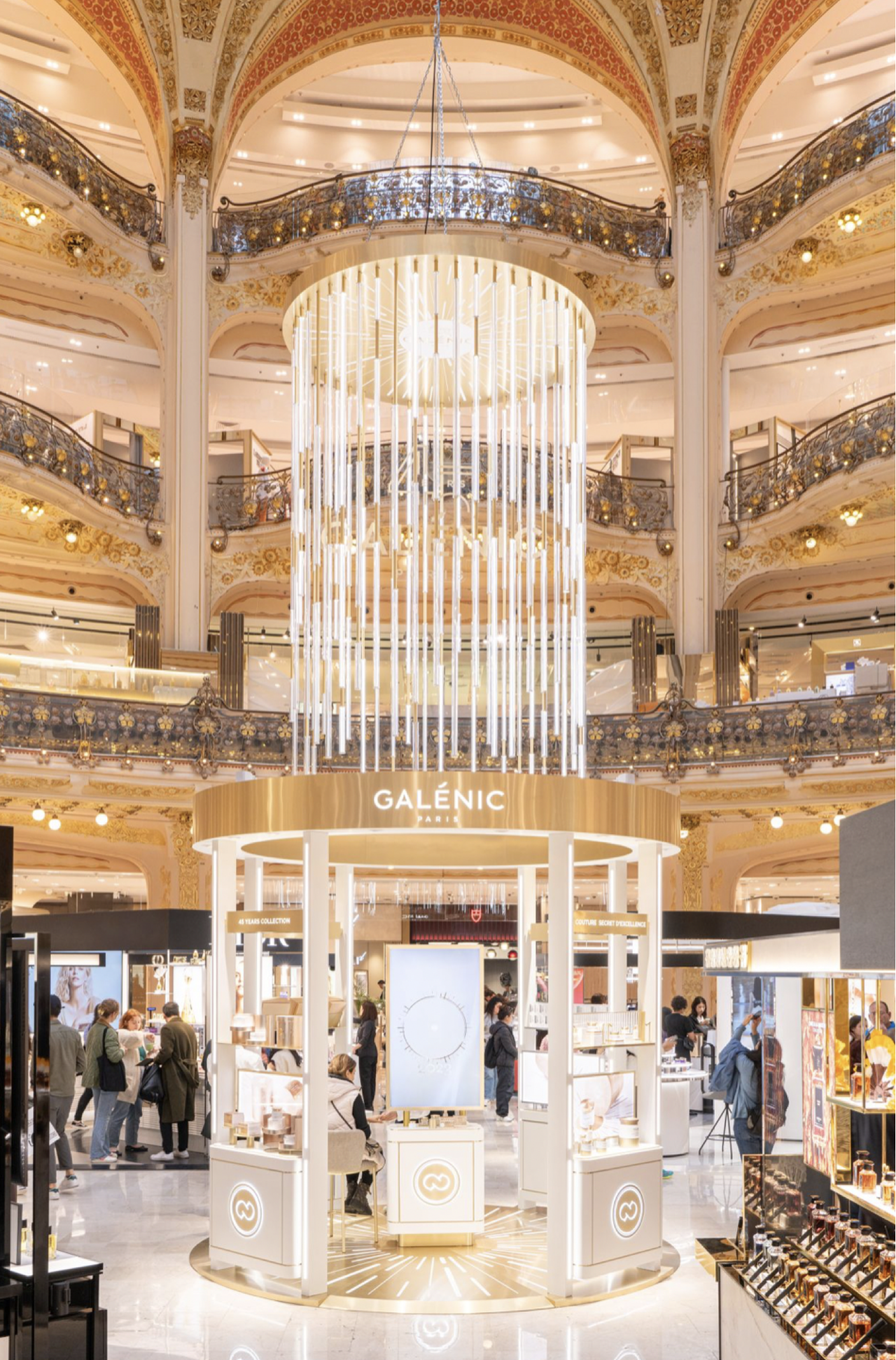 The pattern embodies radiant rays of energy, symbolizing the dynamic power of molecules—a core inspiration behind Galenic’s groundbreaking research and products. This design pays tribute to the scientific innovation and legacy of Galenic’s visionary founder, Pierre Fabre, featured under the iconic dome of Galeries Lafayette.